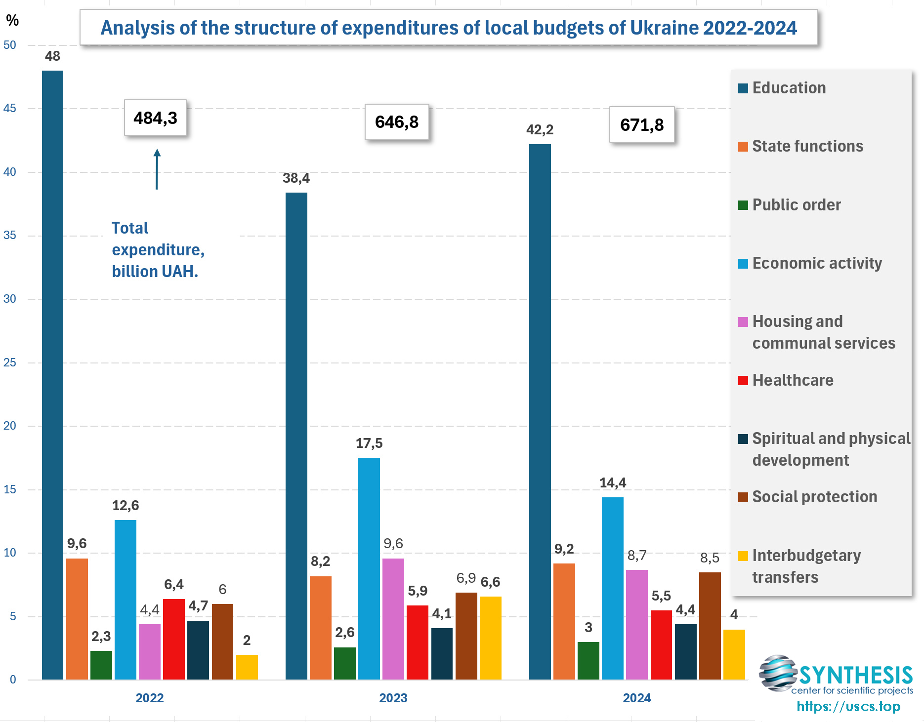 It is quite clear that in the conditions of full-scale aggression, expenditures on this sphere, which has probably suffered the most, will grow. The volume of expenditures of local communities in 2020 amounted to 32.1 billion UAH, while in 2024 this figure increased to 58.6 billion UAH. After the end of the war, the restoration and repair of the housing stock and financing of energy saving measures will be of great importance for communities. In general, over the three-year period of the war with the Russian Federation, we can outline the following general trends in budget policy at the regional and state levels. Defense spending in 2022 increased by 796.4% compared to 2021. Of course, this affected some important areas of state policy. For example, spending on education decreased by 8.3% in the state budget and by 6.7% in local budget expenditures. In local budgets, healthcare expenditures also decreased during this period – the decrease in funding is estimated at 6.3%.