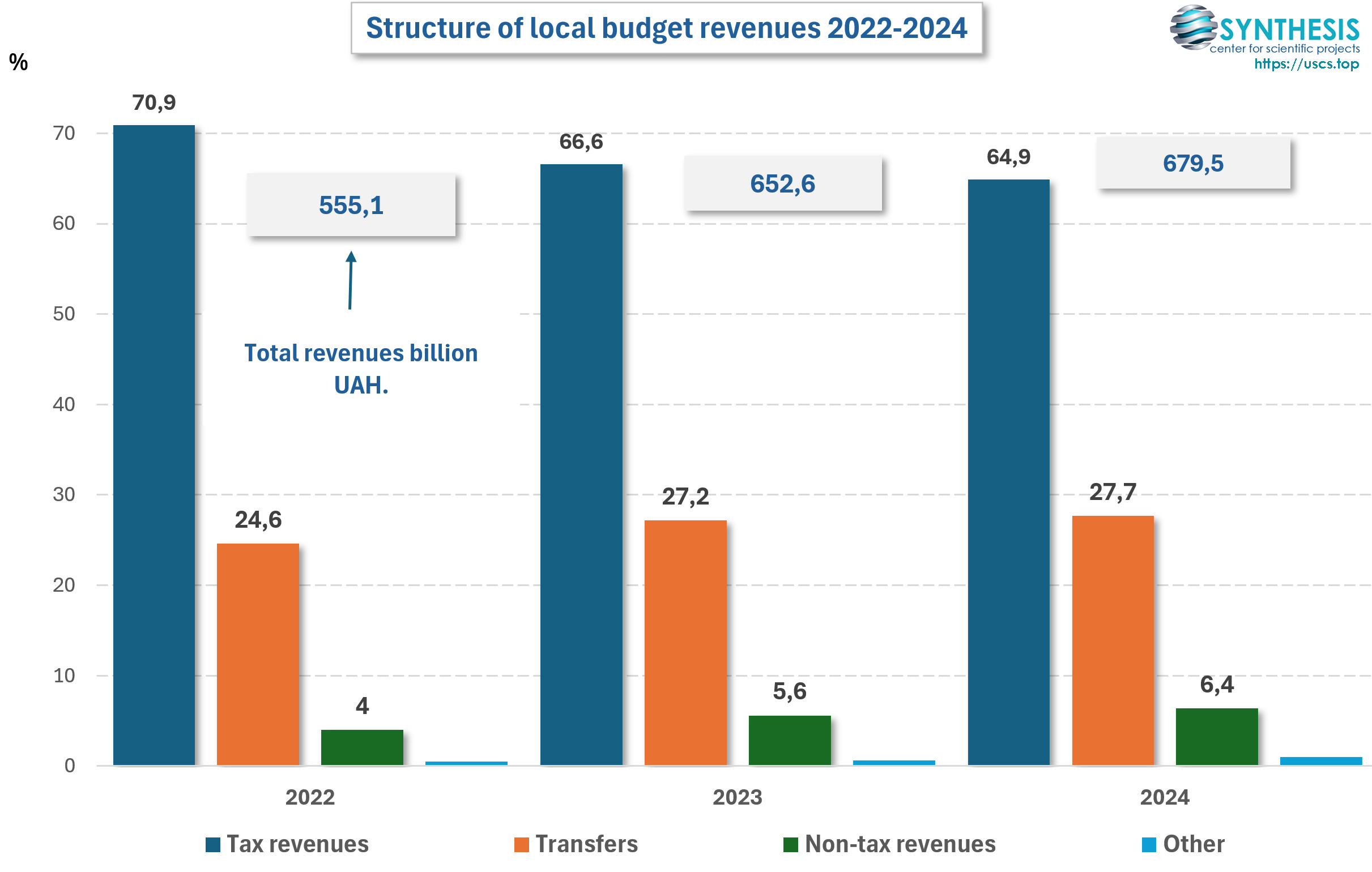 In the structure of local budget revenues, taxes have the largest share. In 2022, according to data from the Ministry of Finance of Ukraine, this figure was 70.9%, and transfers – 24.6%.[2]